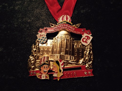 Wir, die Prinzengarde der Stadt Sankt Augustin, haben das Kloster als beherrschendes Element in den Mittelpunkt unseres diesjährigen Sessionsordens aufgenommen, um ein Zeichen hinsichtlich der Bedeutung dieses zentralen Bauwerks für unsere Stadt zu setzen. Darüber hinaus erinnert der diesjährige Sessionsorden daran, dass der Karneval mit seinen Wurzeln im christlichen Glauben verankert ist. So symbolisiert der oberhalb des Klosters und einem Schriftband mit dem Namen der Prinzengarde dargestellte Gardistenhelm mit den gekreuzten Schwertern die Tatsache, dass wir Karnevalisten geistliches und weltliches Brauchtum gleichermaßen ehren. Dem unteren Rand des Ordens ist zu entnehmen, dass der Rheinländer Christentum und Fröhlichkeit sehr wohl miteinander zu verbinden weiß: Nur scheinbar besetzen ein Gardist und eine Gardistin je eine Seite des Ordens; bei Bedarf vermag sich die hübsche Gardistin dank eines Schiebereglers mit Leichtigkeit ihrem männlichen Gegenüber zu nähern und ihn mit einem „Bützchen“ zu verwöhnen.